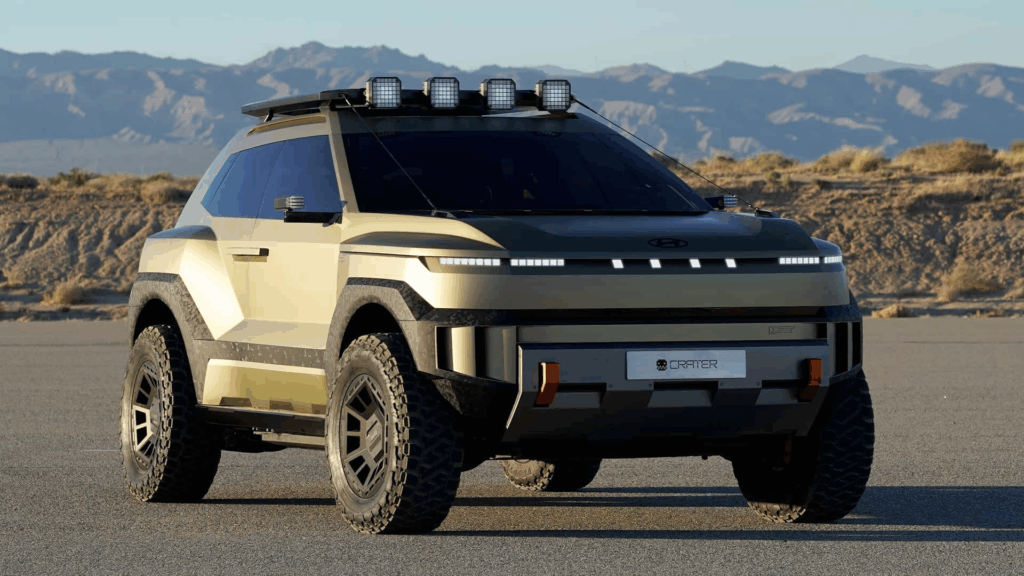 Despite its compact footprint – roughly the same length as an Ioniq 5 – the Crater’s design creates an optical illusion of immense size. This broad, planted stance, tapering aggressively upwards from its massive 35-inch tires to the roof platform, exudes an intimidating presence. These aren’t just large tires for show; they signify serious ground clearance and improved approach/departure angles, essential for any serious off-road SUV. The visually deceptive long wheelbase, characteristic of dedicated EV platforms, contributes to stability while also allowing for exceptional interior packaging, something we’ll delve into shortly.